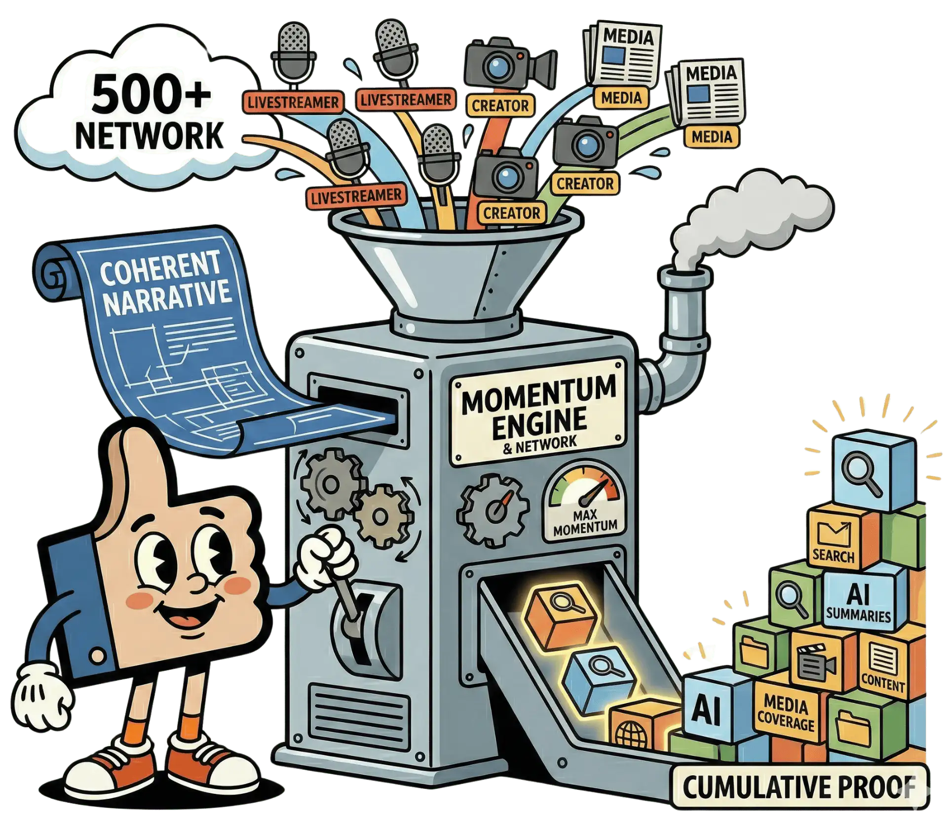 Your message starts showing up in content, search, AI summaries, and media coverage. Not one-off posts. Proof that accumulates.