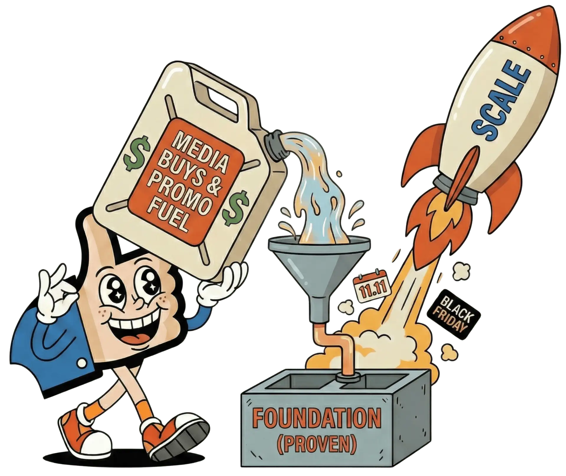 Media buys, promotions, activations, seasonal pushes (11.11, Black Friday) — only after the foundation works.